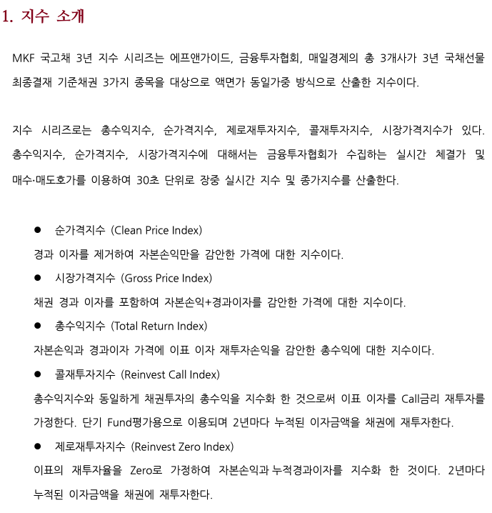 그럼 MKF 국고채 3년 지수가 뭔지 알아봐야할 것이다. 이걸 따로 찾는 것도 일이겠지만, 다행히 이 상품의 기초지수 관련한 문서에 나와있다.