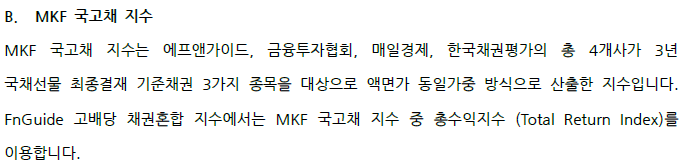 해당 지수는 PLUS 고배당주에서 사용하고 있는 기초지수인 FnGuide 고배당지수와 함께 MKF 국고채 3년 지수를 혼합해서 산출한다고 되어있다. FnGuide 고배당지수는 이미 앞선 글에서 적었으니 해당 내용을 참고하면 될 듯 싶다.(내용이 부실하긴 하지만...)