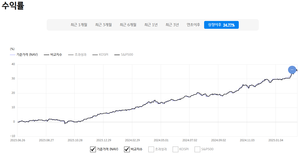 상장이후 34%의 수익률이 났는데, 최근 1년이 24%인걸 보면 24년에 정말 많이 올랐다는 것을 느낄 수 있다.