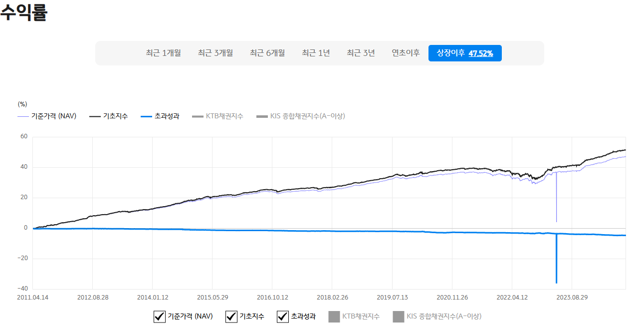 상장 이후 47%정도의 수익이 났다. 13년동안 47%라... 역시 채권, 특히 단기채권이라 수익이 더 낮을 수 밖에 없다.