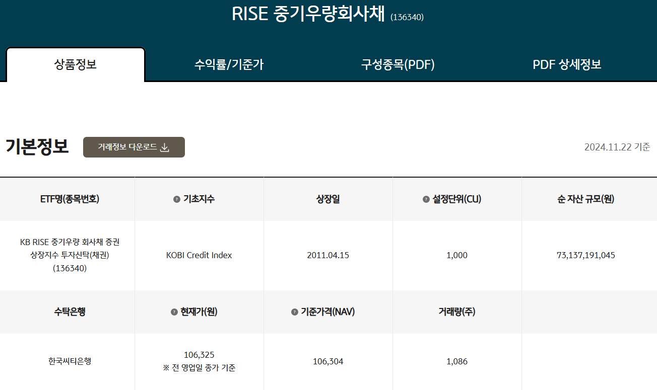 해당 지수를 산출하는 자산평가사의 홈페이지에 들어가서 확인해보니, 잔존만기 5년 이하의 채권으로 구성된다고 한다.