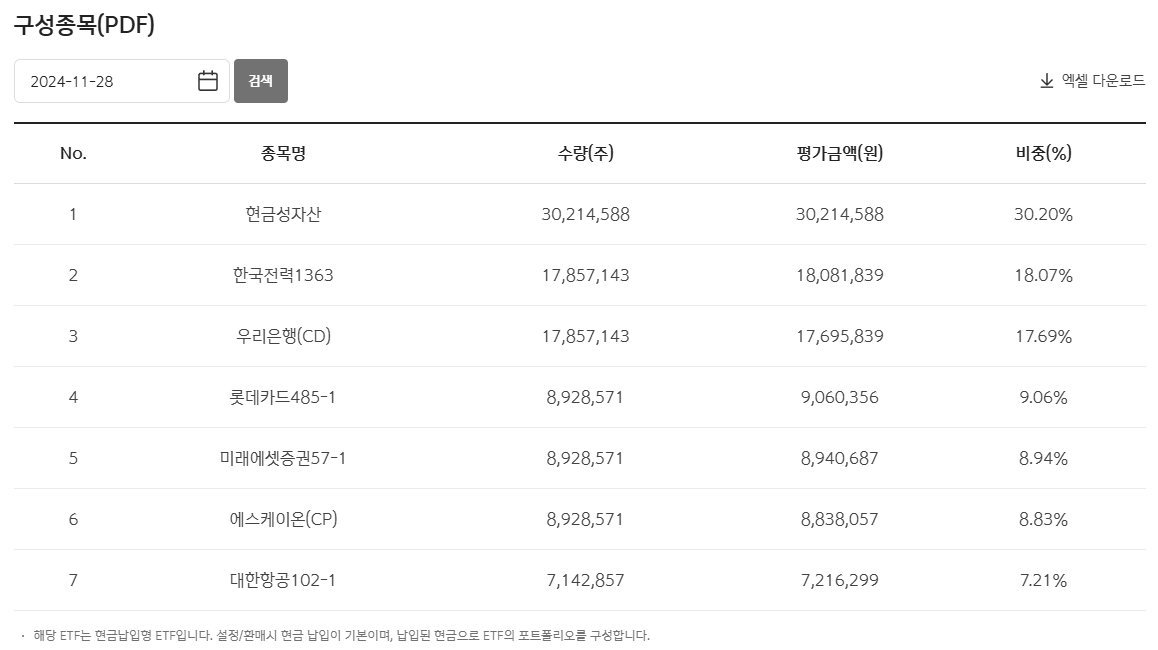 전문용어가 많으니 자세한 분석은 불가능하고, 어쨌건 우량 채권 중 매우 만기가 짧은 상품을 담는다고 보면 되겠다.