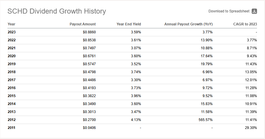 참고로 아래 SCHD의 배당성장률을 살펴보면 감소한 구간이 하나도 없다.