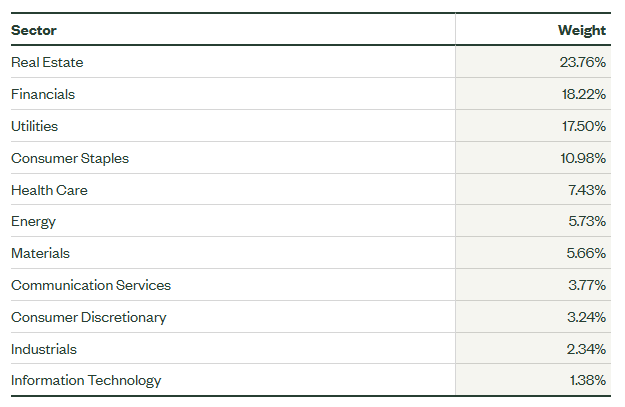 부동산, 금융, 유틸리티, 필수소비재, 헬스케어 순으로 비중이 높다.
