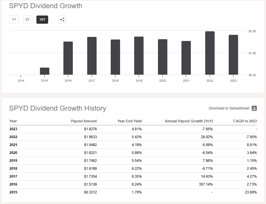 SPYD는 배당률 자체에 초점을 맞추다 보니 배당성장은 약간 놓치고 있다고 볼 수 있다.