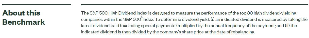 S&P 500 고배당 지수는 S&P 500 지수 내에서 배당 수익률이 가장 높은 상위 80개 기업의 성과를 측정하기 위해 설계되었습니다. 배당 수익률을 결정하는 방법은 다음과 같습니다: (i) 최근에 지급된 배당금(특별 지급 제외)에 연간 지급 빈도를 곱하여 표시된 배당금을 계산하고; (ii) 그 후, 이 표시된 배당금을 재조정 날짜의 회사 주가로 나눕니다.