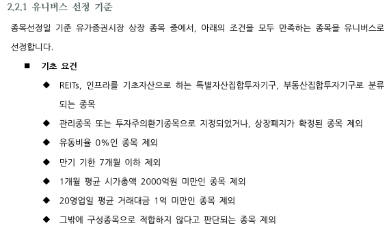 아래는 문서 중 유니버스 선정 기준에 대한 내용을 캡처해 온 것이다.