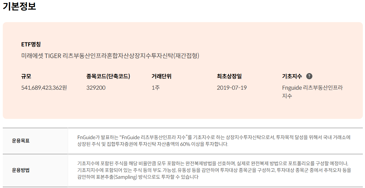 참고로 처음 상장될 때 명칭은 TIGER 부동산인프라였으나, 2022년에 현재의 명칭으로 변경되었다.