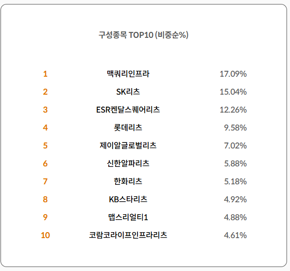 일단 부동산 인프라와 리츠에 투자하는 상품이니 기본적으로 리츠와 인프라를 기초자산으로 하는 종목을 선정한다.