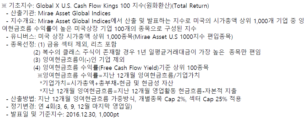 미국에 상장되어 있는 ETF 중 캐시카우와 관련된 ETF를 언뜻 들었던 것 같아서 그 ETF를 우리나라에서 상장시킨 것이 아닌가 싶었는데, 일단 기초지수를 보니 미래에셋에서 만든 것 같다.