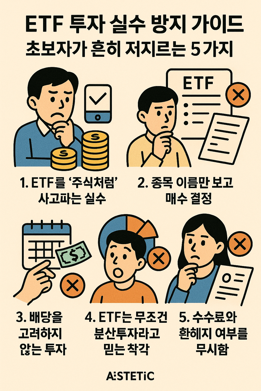 ETF(상장지수펀드)는 초보자도 접근하기 쉬운 투자 상품이지만, 의외로 초보자들이 흔히 하는 실수 때문에 손해를 보는 경우도 많습니다.