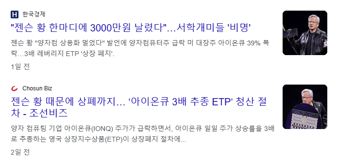 젠슨 황이 양자컴퓨터 관련해서 부정적인 이야기를 했더니 양자컴퓨터 관련 지수가 하루에 -35%가 빠졌고, 3배 레버리지는 거기에 3배니 그냥 사라져버렸다는 것이다.