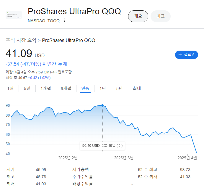 미국 주식 시장이 박살나고 있는 상황인데, 그 중 낙폭이 더 큰 나스닥100의 3배 레버리지인 TQQQ의 하락폭이 정말 무시무시하다.